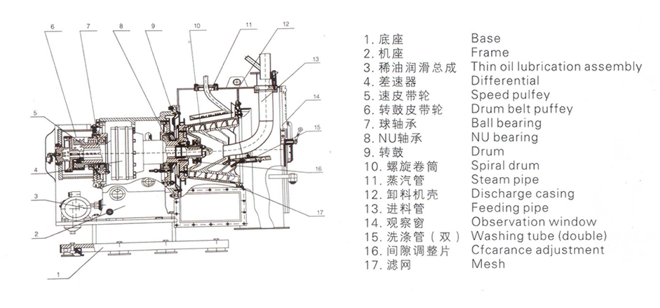 為了減少固態(tài)物的排放阻力,過濾筒有一定的傾斜角度(脫水角度)。利用傾斜角度和螺旋葉片,減少了固體排放阻力。不但極大的提高了其排放效率,而且具有耗電量低,處理量大的優(yōu)點(diǎn)。